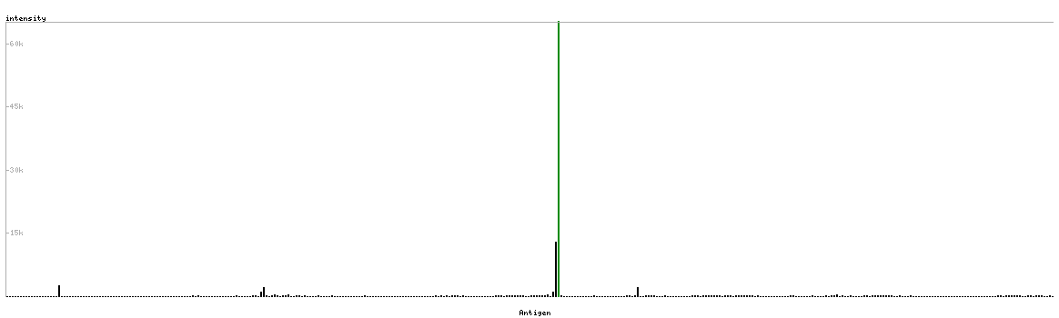 At the top of the view, the position of the antigen (identified by the corresponding HPA identifier) is shown as a green bar. A yellow triangle on the bar indicates a <100% sequence identity to the protein target.
