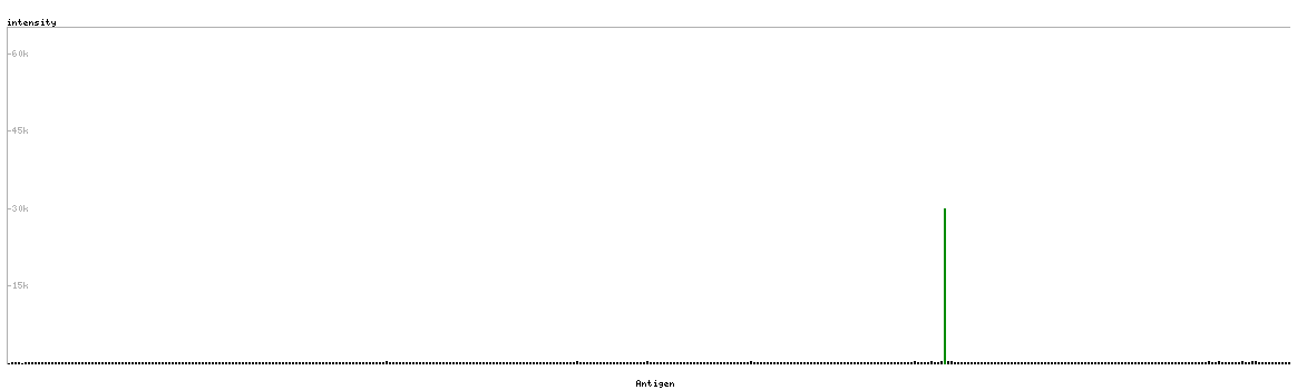 At the top of the view, the position of the antigen (identified by the corresponding HPA identifier) is shown as a green bar. A yellow triangle on the bar indicates a <100% sequence identity to the protein target.