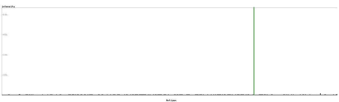 At the top of the view, the position of the antigen (identified by the corresponding HPA identifier) is shown as a green bar. A yellow triangle on the bar indicates a <100% sequence identity to the protein target.