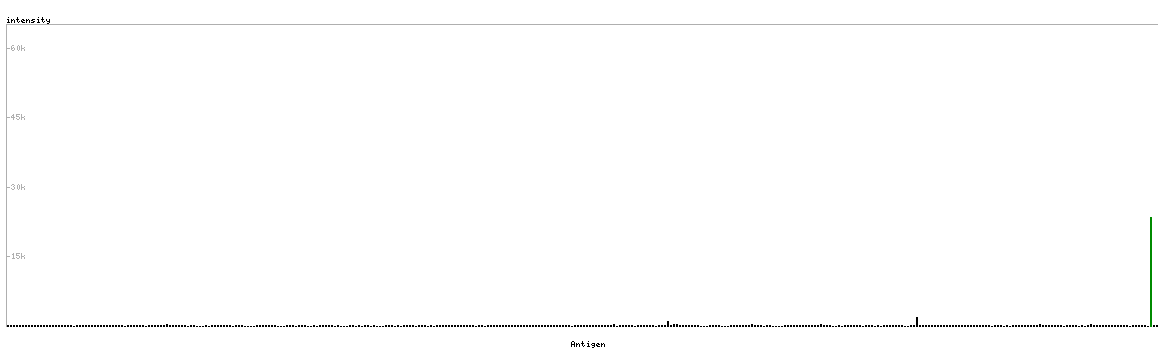 At the top of the view, the position of the antigen (identified by the corresponding HPA identifier) is shown as a green bar. A yellow triangle on the bar indicates a <100% sequence identity to the protein target.