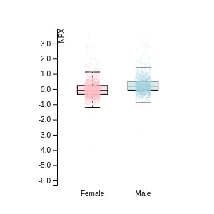 Blood protein levels in 96 healthy adults (aged 50–65) measured at six visits over a two-year period, shown separately for males and females. Relative protein abundances were quantified using the proximity extension assay (PEA) with the Olink Explore HT.