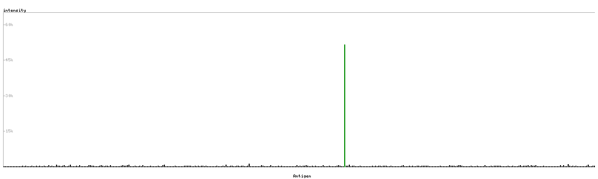 At the top of the view, the position of the antigen (identified by the corresponding HPA identifier) is shown as a green bar. A yellow triangle on the bar indicates a <100% sequence identity to the protein target.