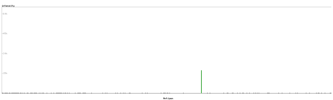 At the top of the view, the position of the antigen (identified by the corresponding HPA identifier) is shown as a green bar. A yellow triangle on the bar indicates a <100% sequence identity to the protein target.