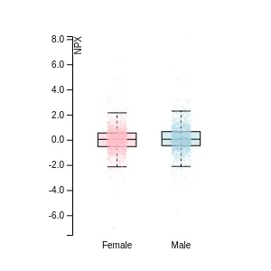 Blood protein levels in 96 healthy adults (aged 50–65) measured at six visits over a two-year period, shown separately for males and females. Relative protein abundances were quantified using the proximity extension assay (PEA) with the Olink Explore HT.