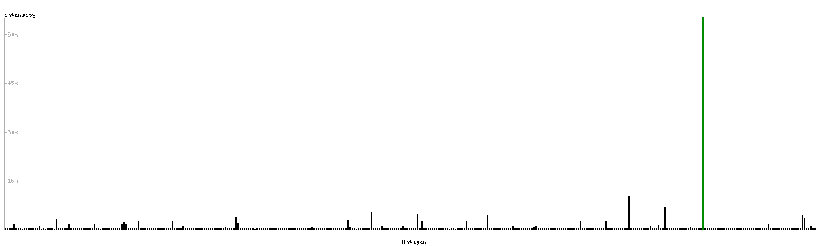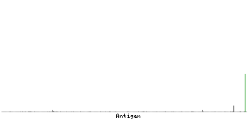 At the top of the view, the position of the antigen (identified by the corresponding HPA identifier) is shown as a green bar. A yellow triangle on the bar indicates a <100% sequence identity to the protein target.