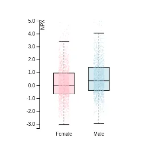 Blood protein levels in 96 healthy adults (aged 50–65) measured at six visits over a two-year period, shown separately for males and females. Relative protein abundances were quantified using the proximity extension assay (PEA) with the Olink Explore HT.