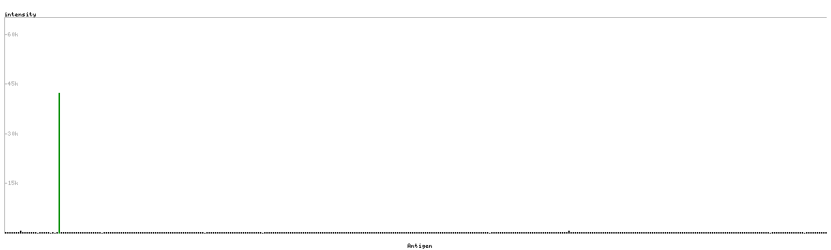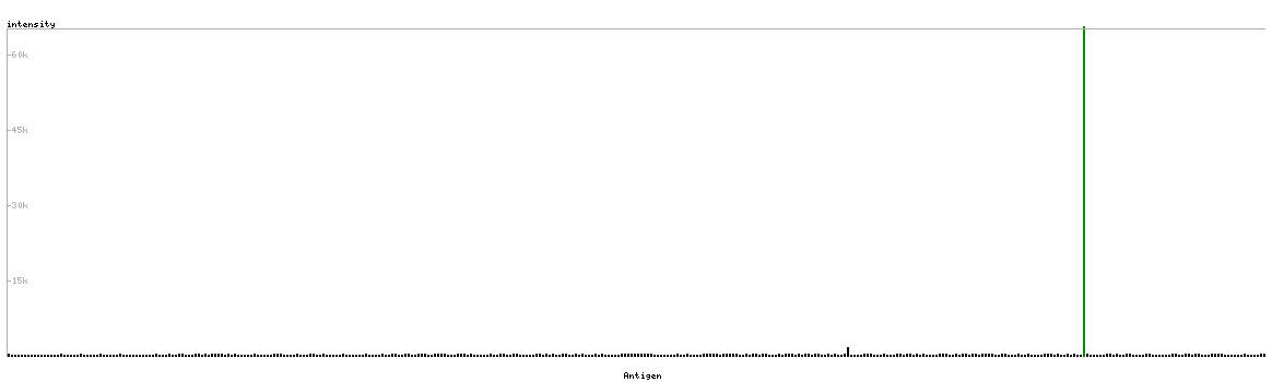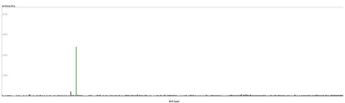 At the top of the view, the position of the antigen (identified by the corresponding HPA identifier) is shown as a green bar. A yellow triangle on the bar indicates a <100% sequence identity to the protein target.