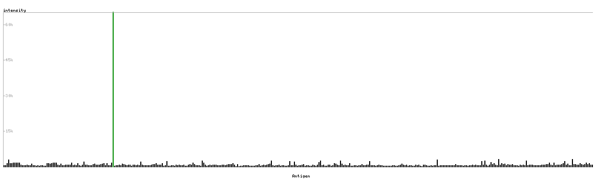 At the top of the view, the position of the antigen (identified by the corresponding HPA identifier) is shown as a green bar. A yellow triangle on the bar indicates a <100% sequence identity to the protein target.