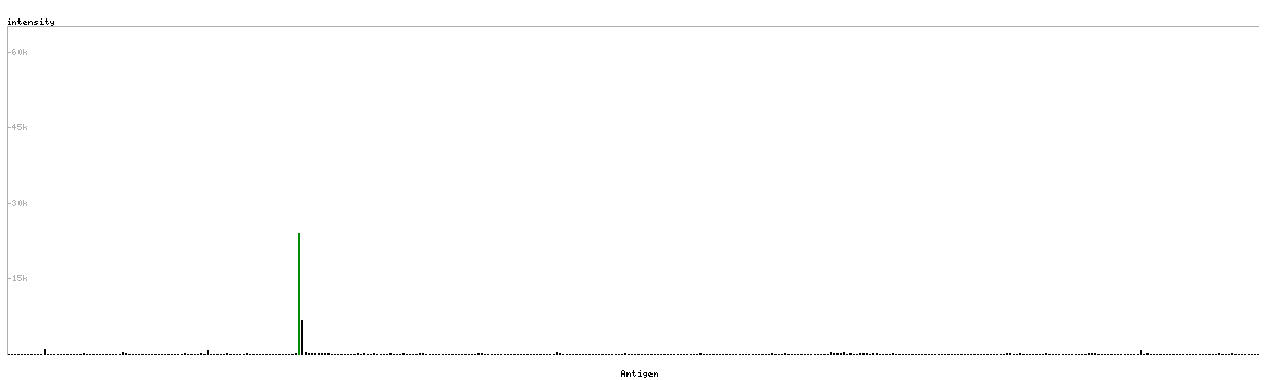 At the top of the view, the position of the antigen (identified by the corresponding HPA identifier) is shown as a green bar. A yellow triangle on the bar indicates a <100% sequence identity to the protein target.