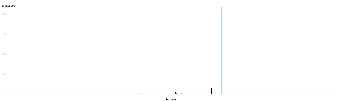 At the top of the view, the position of the antigen (identified by the corresponding HPA identifier) is shown as a green bar. A yellow triangle on the bar indicates a <100% sequence identity to the protein target.