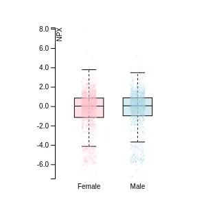 Blood protein levels in 96 healthy adults (aged 50–65) measured at six visits over a two-year period, shown separately for males and females. Relative protein abundances were quantified using the proximity extension assay (PEA) with the Olink Explore HT.
