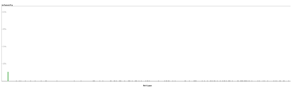 At the top of the view, the position of the antigen (identified by the corresponding HPA identifier) is shown as a green bar. A yellow triangle on the bar indicates a <100% sequence identity to the protein target.