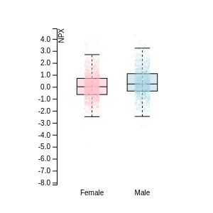 Blood protein levels in 96 healthy adults (aged 50–65) measured at six visits over a two-year period, shown separately for males and females. Relative protein abundances were quantified using the proximity extension assay (PEA) with the Olink Explore HT.