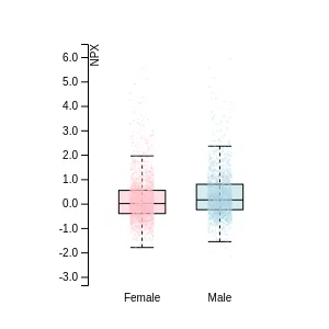 A gene is classified as upregulated in a disease if the average concentration of all samples of that disease is significantly higher (adj P-value<0.005 and NPX difference>=1) than the average concentration of samples of all diseases as measured by PEA . For gender specific diseases the analysis includes only samples corresponding to the same gender from the other diseases.