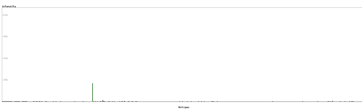 At the top of the view, the position of the antigen (identified by the corresponding HPA identifier) is shown as a green bar. A yellow triangle on the bar indicates a <100% sequence identity to the protein target.