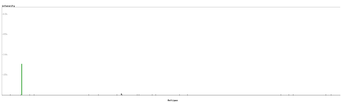 At the top of the view, the position of the antigen (identified by the corresponding HPA identifier) is shown as a green bar. A yellow triangle on the bar indicates a <100% sequence identity to the protein target.
