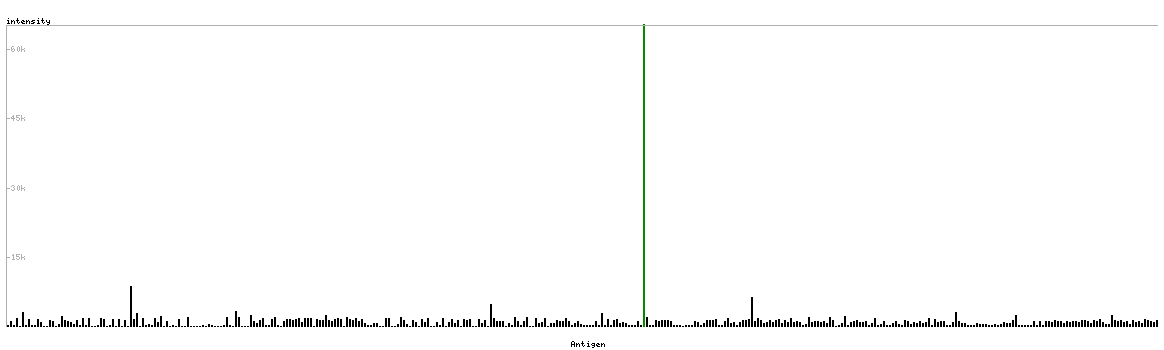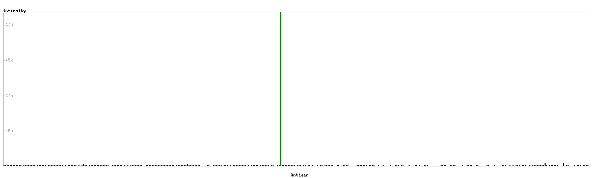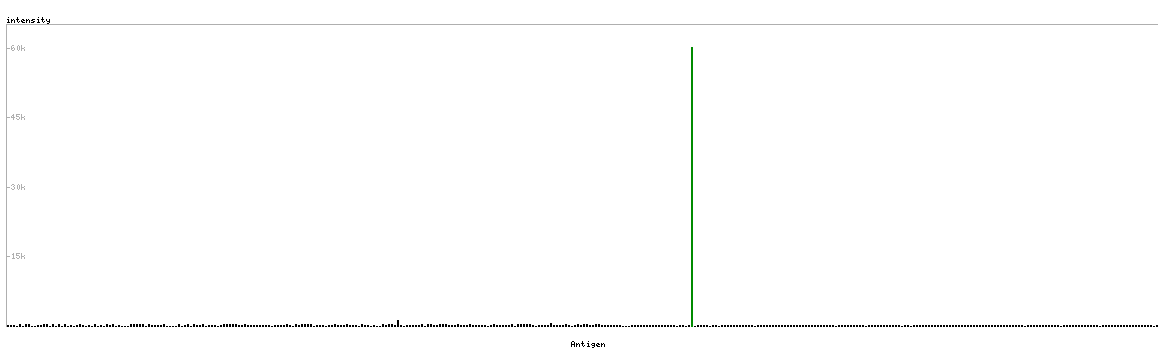 At the top of the view, the position of the antigen (identified by the corresponding HPA identifier) is shown as a green bar. A yellow triangle on the bar indicates a <100% sequence identity to the protein target.