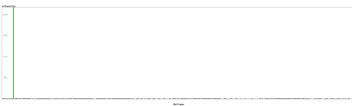 At the top of the view, the position of the antigen (identified by the corresponding HPA identifier) is shown as a green bar. A yellow triangle on the bar indicates a <100% sequence identity to the protein target.
