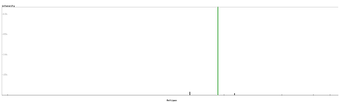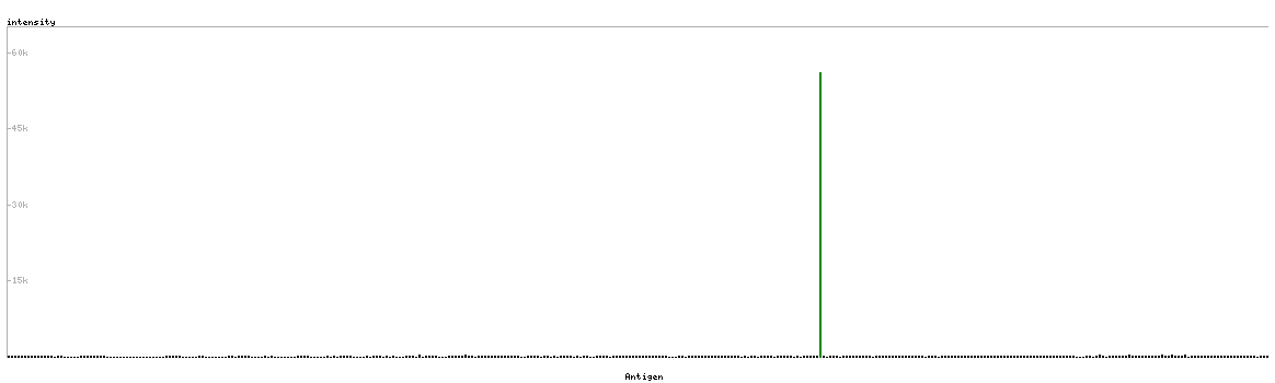 At the top of the view, the position of the antigen (identified by the corresponding HPA identifier) is shown as a green bar. A yellow triangle on the bar indicates a <100% sequence identity to the protein target.