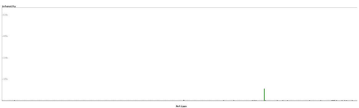 At the top of the view, the position of the antigen (identified by the corresponding HPA identifier) is shown as a green bar. A yellow triangle on the bar indicates a <100% sequence identity to the protein target.