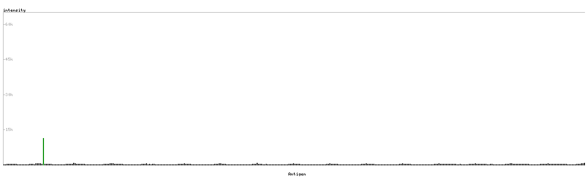 At the top of the view, the position of the antigen (identified by the corresponding HPA identifier) is shown as a green bar. A yellow triangle on the bar indicates a <100% sequence identity to the protein target.