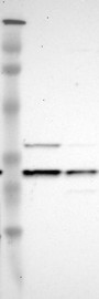 The staining of an antibody is evaluated by Western Blot through analysis of samples from different cell lysates. A supportive score is given if band(s) of predicted size in kDa (+/-20%) is detected.
