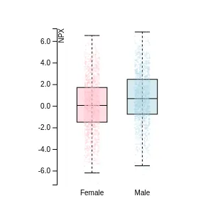 Blood protein levels in 96 healthy adults (aged 50–65) measured at six visits over a two-year period, shown separately for males and females. Relative protein abundances were quantified using the proximity extension assay (PEA) with the Olink Explore HT.