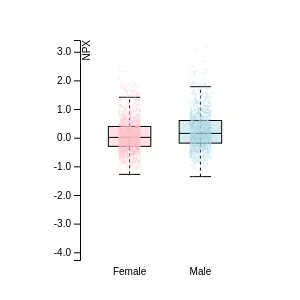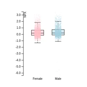 Blood protein levels in 96 healthy adults (aged 50–65) measured at six visits over a two-year period, shown separately for males and females. Relative protein abundances were quantified using the proximity extension assay (PEA) with the Olink Explore HT.
