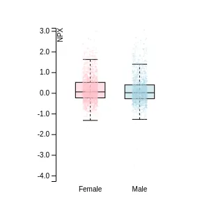 Blood protein levels in 96 healthy adults (aged 50–65) measured at six visits over a two-year period, shown separately for males and females. Relative protein abundances were quantified using the proximity extension assay (PEA) with the Olink Explore HT.