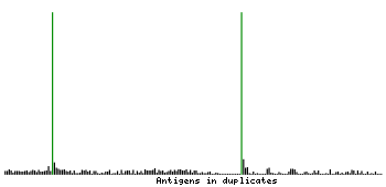 At the top of the view, the position of the antigen (identified by the corresponding HPA identifier) is shown as a green bar. A yellow triangle on the bar indicates a <100% sequence identity to the protein target.
