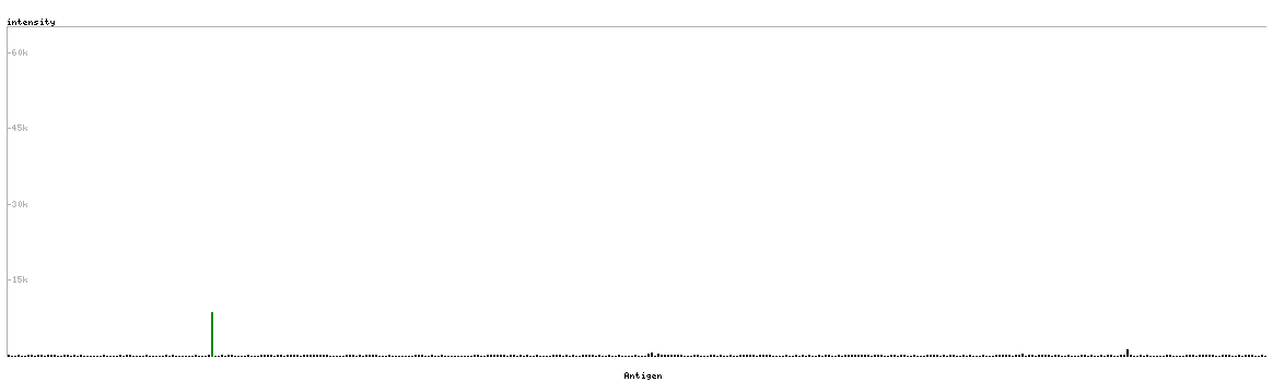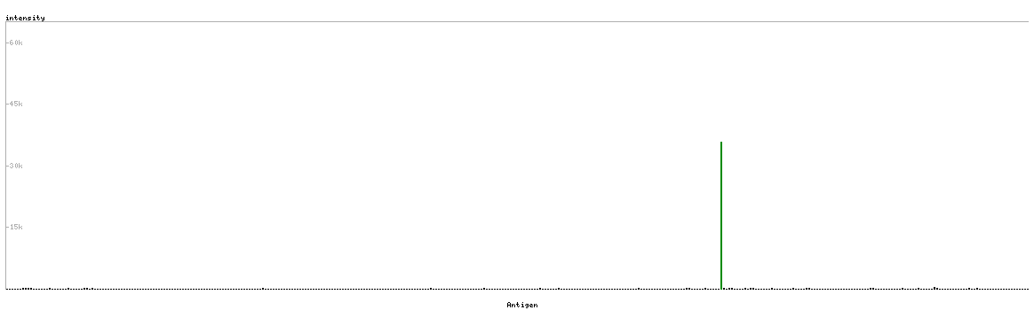 At the top of the view, the position of the antigen (identified by the corresponding HPA identifier) is shown as a green bar. A yellow triangle on the bar indicates a <100% sequence identity to the protein target.