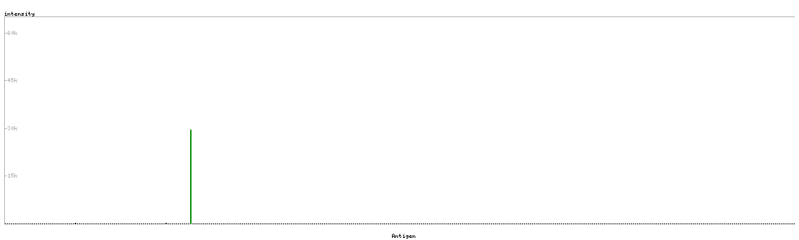 At the top of the view, the position of the antigen (identified by the corresponding HPA identifier) is shown as a green bar. A yellow triangle on the bar indicates a <100% sequence identity to the protein target.