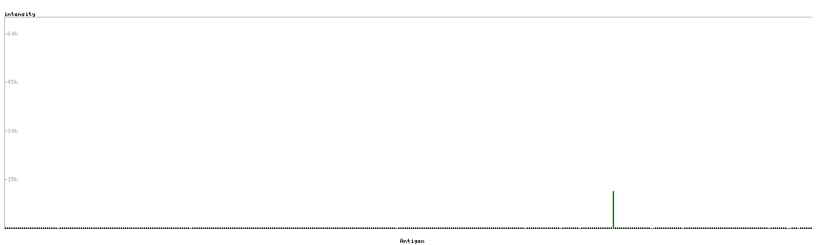 At the top of the view, the position of the antigen (identified by the corresponding HPA identifier) is shown as a green bar. A yellow triangle on the bar indicates a <100% sequence identity to the protein target.