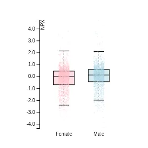Blood protein levels in 96 healthy adults (aged 50–65) measured at six visits over a two-year period, shown separately for males and females. Relative protein abundances were quantified using the proximity extension assay (PEA) with the Olink Explore HT.