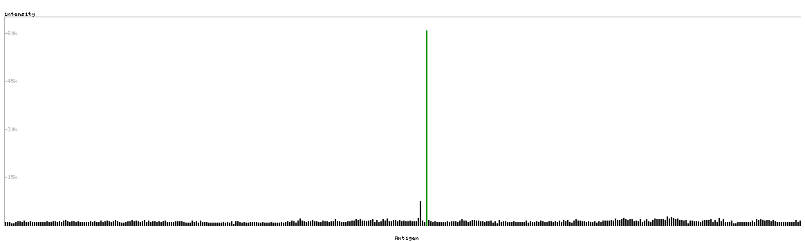 At the top of the view, the position of the antigen (identified by the corresponding HPA identifier) is shown as a green bar. A yellow triangle on the bar indicates a <100% sequence identity to the protein target.