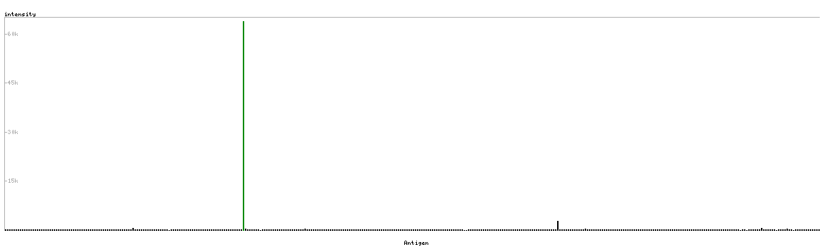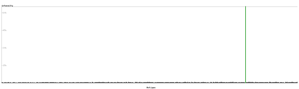 At the top of the view, the position of the antigen (identified by the corresponding HPA identifier) is shown as a green bar. A yellow triangle on the bar indicates a <100% sequence identity to the protein target.