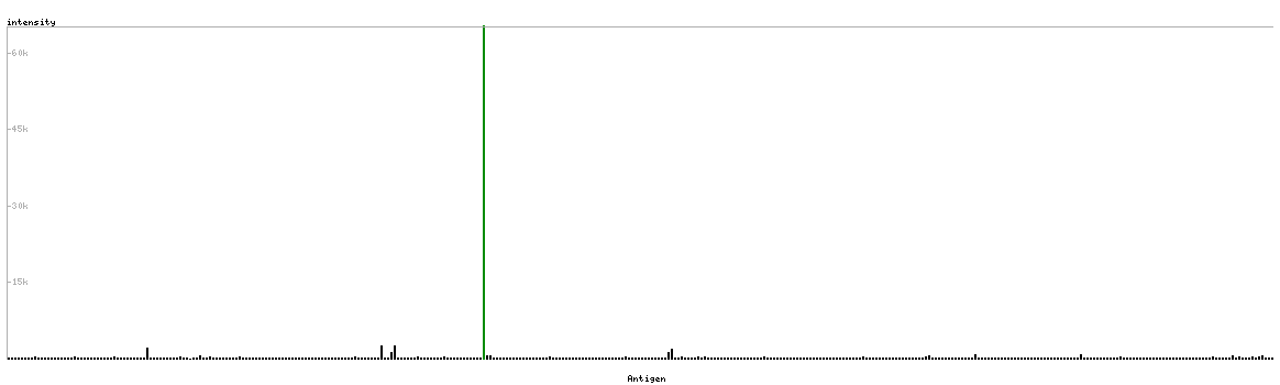 At the top of the view, the position of the antigen (identified by the corresponding HPA identifier) is shown as a green bar. A yellow triangle on the bar indicates a <100% sequence identity to the protein target.