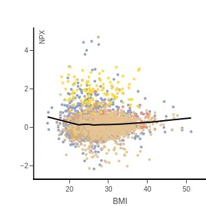 Blood protein levels by age, BMI, and sex, measured using the proximity extension assay (PEA) with the Olink Explore 1536. In the age and sex scatterplots, samples are colored by disease class.