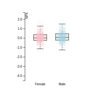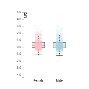 Blood protein levels in 96 healthy adults (aged 50–65) measured at six visits over a two-year period, shown separately for males and females. Relative protein abundances were quantified using the proximity extension assay (PEA) with the Olink Explore HT.
