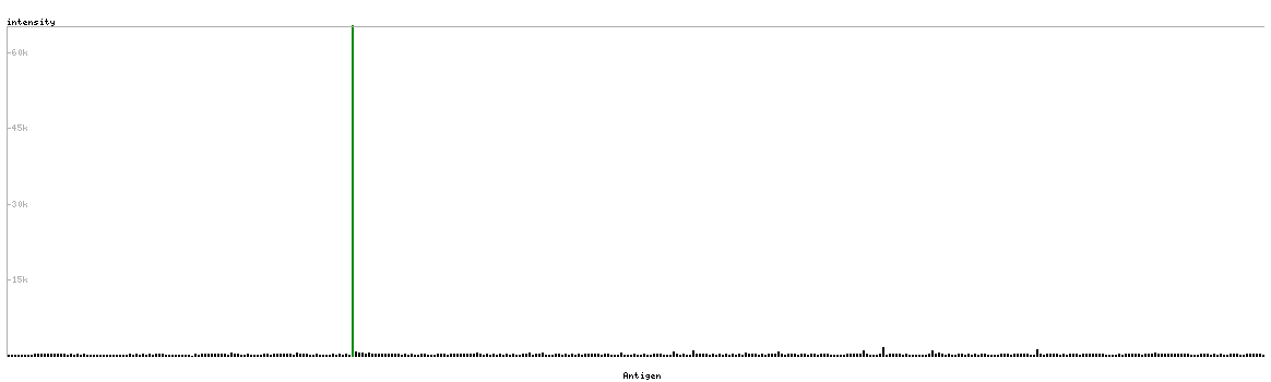 At the top of the view, the position of the antigen (identified by the corresponding HPA identifier) is shown as a green bar. A yellow triangle on the bar indicates a <100% sequence identity to the protein target.