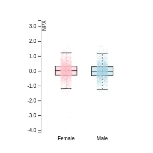 Blood protein levels in 96 healthy adults (aged 50–65) measured at six visits over a two-year period, shown separately for males and females. Relative protein abundances were quantified using the proximity extension assay (PEA) with the Olink Explore HT.