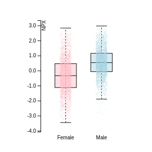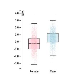 Blood protein levels in 96 healthy adults (aged 50–65) measured at six visits over a two-year period, shown separately for males and females. Relative protein abundances were quantified using the proximity extension assay (PEA) with the Olink Explore HT.