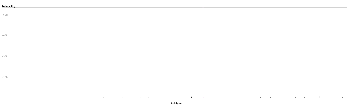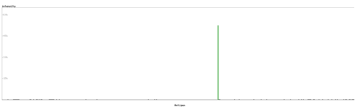 At the top of the view, the position of the antigen (identified by the corresponding HPA identifier) is shown as a green bar. A yellow triangle on the bar indicates a <100% sequence identity to the protein target.