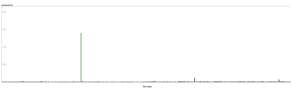 At the top of the view, the position of the antigen (identified by the corresponding HPA identifier) is shown as a green bar. A yellow triangle on the bar indicates a <100% sequence identity to the protein target.