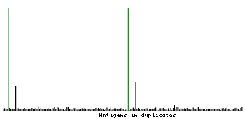 At the top of the view, the position of the antigen (identified by the corresponding HPA identifier) is shown as a green bar. A yellow triangle on the bar indicates a <100% sequence identity to the protein target.