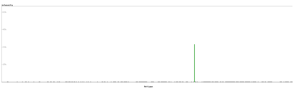 At the top of the view, the position of the antigen (identified by the corresponding HPA identifier) is shown as a green bar. A yellow triangle on the bar indicates a <100% sequence identity to the protein target.
