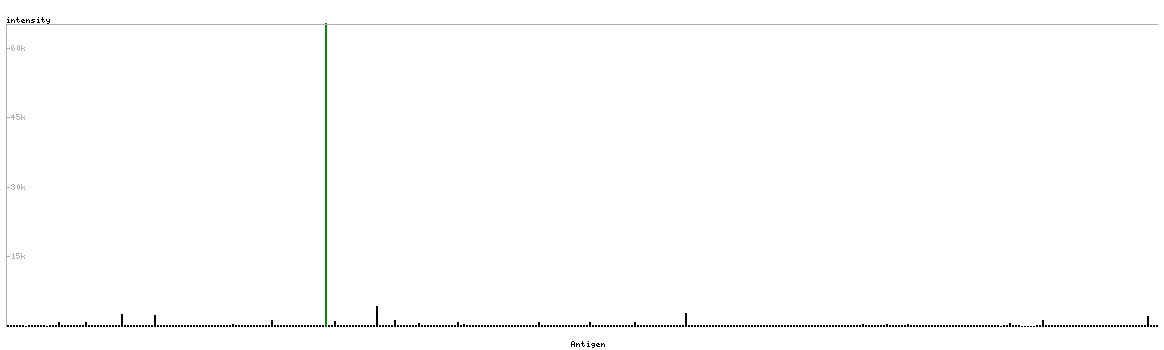 At the top of the view, the position of the antigen (identified by the corresponding HPA identifier) is shown as a green bar. A yellow triangle on the bar indicates a <100% sequence identity to the protein target.