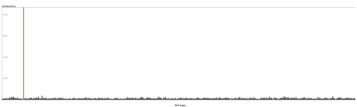 At the top of the view, the position of the antigen (identified by the corresponding HPA identifier) is shown as a green bar. A yellow triangle on the bar indicates a <100% sequence identity to the protein target.