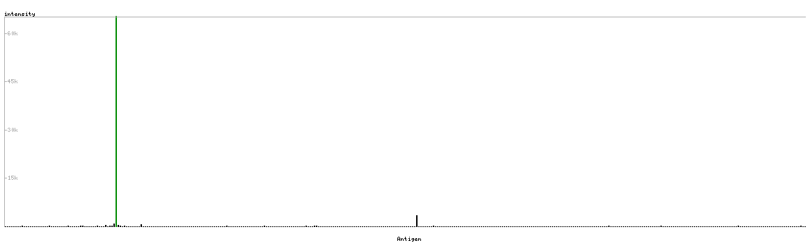 At the top of the view, the position of the antigen (identified by the corresponding HPA identifier) is shown as a green bar. A yellow triangle on the bar indicates a <100% sequence identity to the protein target.