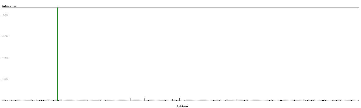 At the top of the view, the position of the antigen (identified by the corresponding HPA identifier) is shown as a green bar. A yellow triangle on the bar indicates a <100% sequence identity to the protein target.